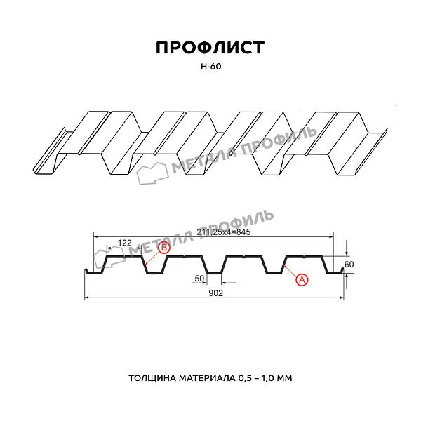 Профлист МЕТАЛЛ ПРОФИЛЬ Н-60x845-A (PURMAN-20-8017-0,5) — популярный материал для обустройства профилированного листа. Изначально он представляет собой лист оцинкованной стали с покрытием. Общая толщина металла с цинковым и полимерным слоем составляет 0.5 мм. Проходя процедуру холодного проката, сталь приобретает рисунок из ритмичных волн. Такая форма придает профилю несущую способность.